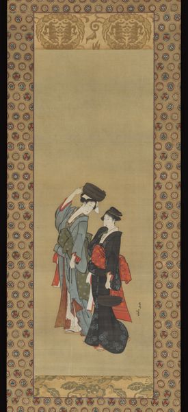 This hanging scroll, titled "Puppeteer with Puppet," was painted with ink and color on silk by Tsukioka Sessai, likely in the late 18th or early 19th century. The painting's beauty resides not just in its elegant depiction of the subject, but also in the meticulous application of ink and color. The silk's delicate weave provides a receptive ground for the artist's brush, allowing for subtle gradations of tone and texture. Look closely, and you'll see how the artist skillfully layers colors to create depth and dimension, bringing the figures to life. The creation of such a scroll required considerable skill. Preparing the silk, mixing the inks and pigments, and executing the painting demanded years of training. The scroll format itself, with its careful mounting and framing, speaks to a culture that valued refinement and connoisseurship. It is a beautiful example of the traditional painting techniques of the Edo period.