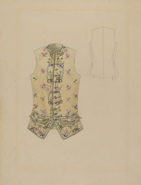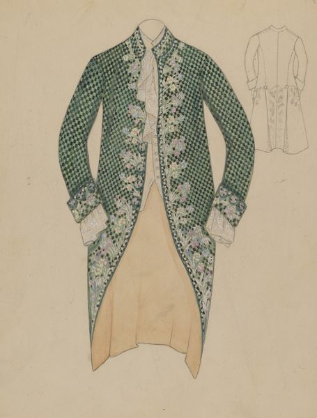 This drawing of a suit was made by an anonymous artist with graphite and watercolor. It feels like a record of a process. The way the drawing is made, with a focus on the details of the suit’s design, suggests a deep interest in the act of creation. The paper is light and the graphite lines are delicate, yet the watercolor gives it a robust material presence. The application of color isn't about blending, it’s more like each mark is left to do its thing. Notice the detailing of the flowers: they are all different and have their own perspective. If you look closely you can see the tiny details and the way the artist worked with a fine brush, adding layers to create a sense of depth. It's not about hiding the process, but about reveling in it. The precision in the rendering reminds me of the fashion illustrations of Erte, but with a more casual, hands-on feel. I'm left thinking about how art is just a conversation that unfolds across time, a way for artists to connect and build on each other's ideas.