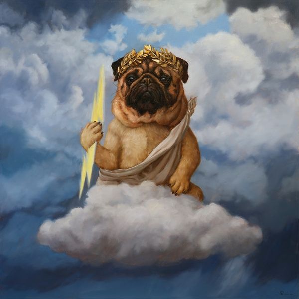 Editor: Lucia Heffernan's oil painting, "The Good, The Bad, And The Pugly," is definitely memorable. It's hard to miss, given the somewhat ridiculous image of a pug dressed as a cowboy, complete with a bandana and what appears to be a lit match. What stands out to you most when you look at this artwork? Curator: The humor strikes me, yes, but I'm drawn to the layered symbols. The cowboy, instantly recognizable as a figure of rugged individualism, grit, and expansion. But the pug—that domestication, that inherent softness—immediately undercuts the cowboy’s visual mythology. What happens to those values, those myths, when embodied by this particular creature? The artist is asking us to re-evaluate familiar icons, challenging how we understand even our own cultural narratives. Does the cowboy, in this form, still evoke the same emotions? Editor: That's a fascinating way to put it. It makes me think about how easily we accept images without questioning their underlying meaning. Is the juxtaposition the main tool here? Curator: Absolutely, the incongruity is key. What does it mean to you that the artist gives the dog agency, by way of clothing, tools and action, traditionally not granted to animals? It becomes more than a cute painting. It challenges power dynamics; maybe it is also commenting on who gets to tell these stories. Editor: I never would have considered those things just from looking at the painting. It’s interesting how much more meaning there is when you start digging into the symbolism. Thank you for enlightening me. Curator: My pleasure! And that is the magic of art: symbols evolve, shift, are repurposed through the ages. The painting itself becomes another layer in the cultural conversation.