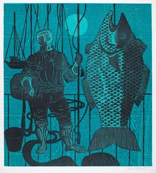 Curator: First impression: a kind of unsettling abundance, like a fisherman's dream...or nightmare. Editor: Yes, unsettling is right. We're looking at Larry Stark's "Red Stringer White Bass," held here at the Harvard Art Museums. It's roughly 33 by 22 centimeters. Curator: What gets me is how the fish eyes lock onto you, like a chorus line of stares. It feels ancient, almost totemic. Editor: Fish have always been potent symbols. Think of early Christian imagery, or the zodiac sign Pisces. It speaks to fertility, transformation, the depths of the unconscious. Curator: And those red strings...like a visual lifeline, connecting them, and maybe us, to something primal. Editor: Indeed, the string could symbolize a cyclical connection to life and death, a recurring motif across cultures. Curator: It's stark, yet tender in its own way. Like a meditation on the fleeting nature of beauty and the interconnectedness of all things. Editor: It certainly offers a look into a world beneath the surface, both literally and symbolically. Food for thought, indeed!