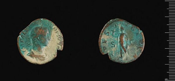 Curator: Here we have a Coin of Phokas from the Harvard Art Museums. Look at the patina! Editor: It looks as if it has been through a lot. It evokes a sense of time and turmoil. Curator: Yes, and that color comes from the slow reaction of the coin's metallic components with its environment, a direct physical record of its existence. It is a small item, but has quite a bit of heft. Editor: Exactly! This object connects us to the history of economic structures, imperial power, and social unrest during Phokas's reign, and the legacy of his policies. Curator: I appreciate how the degradation caused by its materiality actually enriches the narrative. Editor: Indeed. An artifact that sparks a deeper consideration of how political systems impact everyday life.