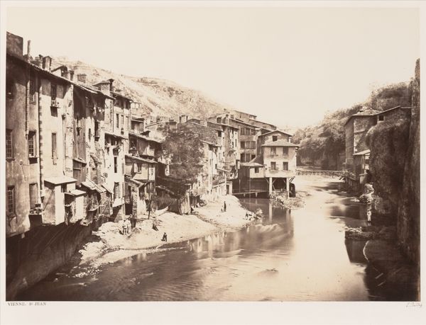 This is an anonymous photograph taken in Vienne by Delizy, presenting a landscape framed by architecture and nature. The sepia tones and small scale lend it a delicate, intimate feel. Structurally, the composition is divided into three distinct horizontal layers. The base is dominated by a river, flanked by densely packed buildings that lead the eye towards the middle ground. The upper third dramatically shifts to a natural landscape, a steep hill crowned with the stark ruin of the Château de La Batie. The image plays with contrasts: the geometric regularity of the urban architecture against the rugged, organic form of the hillside. This juxtaposition introduces a dialogue between human construction and natural decay, challenging fixed meanings of progress and permanence. Semiotically, the ruined castle atop the hill is a signifier of history, power, and the transience of human endeavor. The photograph invites a consideration of how we impose order on the environment, and how time inevitably disrupts these arrangements.