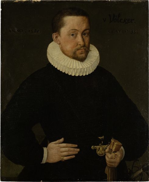 Editor: This is a portrait of Paulus Cornelisz van Beresteyn, painted in 1592 by Jacob Willemsz. Delff. It's striking how direct and confident his gaze is. What stands out to you about this painting? Curator: I see a fascinating visual language at play here, a kind of constructed identity rooted in civic pride and familial legacy. Notice the coat of arms in the upper right, a clear assertion of lineage. The letter he holds, and his very deliberate hand gestures, almost invite interpretation like symbolic gestures within a play. What might these objects represent in the theatre of his life? Editor: So you see these things as performative symbols? I hadn't considered that. Is there something specific about the letter? Curator: Absolutely. Letters in portraits of this era aren't simply props. They represent communication, intellect, and, crucially, a connection to the wider world of trade and diplomacy that fuelled the Dutch Golden Age. It suggests he is a man of affairs, directly involved in the business of state, linking to broader European events. The letter symbolizes something even greater, right? Editor: The ring! Curator: Yes! Consider the prominent ring—it screams wealth and status, but might there be a family crest or significant design element incorporated into it? The painter leaves visual clues that construct this narrative. These carefully placed symbols work together to solidify the image of a capable, respectable, and powerful leader. What do we, as viewers centuries later, take away from this meticulously crafted image? Editor: I see what you mean. It is a constructed identity, not just a likeness. It is really interesting how symbols accumulate meanings and tell larger stories. Curator: Precisely! It is a dance of symbolic gestures revealing this man’s self-representation within the broader context of his time. Food for thought!