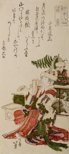 Editor: This is "Woman Writing by Sake Barrel" by Hokusai, from the series "Eight Drinking Immortals." It's a beautiful woodblock print. The textures and patterns really stand out. What can you tell me about the way Hokusai used the materials available to him? Curator: Hokusai's work often bridges the gap between the elite arts and everyday life. The sake barrel itself, prominently displayed, speaks to the materials and consumption habits of the time. What does the act of writing, coupled with the presence of sake, tell us about the social context surrounding artistic creation? Editor: So, the material culture – the sake, the paper, even the woodblocks – informs the meaning of the piece? Curator: Precisely. By considering the means of production and consumption, we gain insight into Hokusai's commentary on society, labor, and the artistic process itself. Editor: I hadn't thought about the social implications of the materials themselves before! Curator: Considering these elements gives us an understanding of Hokusai's worldview.