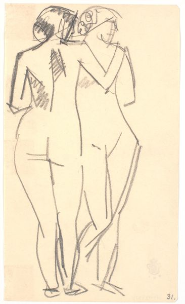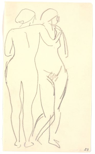 Curator: This intriguing pencil drawing is entitled "To stående modeller," or "Two Standing Models." It was created by Karl Isakson sometime between 1914 and 1915. Editor: The sheer economy of line! The bodies emerge as if whispered onto the paper. There's something vulnerable yet statuesque in their posture, isn’t there? Curator: Indeed. Note the way Isakson simplifies the forms, reducing the figures to their essential lines. It is remarkable how much he communicates with so little detail, especially when exploring the nude. The negative space is just as critical to the piece. Editor: Absolutely. That negative space, the expanse of untouched paper, really contributes to a sense of isolation, even perhaps alienation, that often marks modernist explorations of the figure. And the figures almost seem to be sheltering or protecting each other. I wonder about its implications, if it echoes some cultural anxiety about feminine figures or their connection. Curator: It is true that the intertwined nature of the women can indicate not only mutual emotional support, but also, within its historical context, the complexities and ambiguities around the representation of women's relationships, particularly in the period leading up to and during World War I. Editor: The texture—or rather the lack of it. Everything hinges on this network of lines and angles that almost look like the broken pieces of an idealised form, only tentatively reassembled. It really makes you appreciate how Isakson finds ways to play with suggestion. It isn’t photorealism, but more concerned with presenting core essence. Curator: Yes, this exploration is more about conveying feeling than mirroring form. Isakson delves into an abstract rendering of the human body and the intangible aspects of relationships through just line. Editor: An elegant, yet almost Spartan visual language. So much said, but always held carefully in reserve. Curator: It invites endless possibilities for personal associations and resonates deeply even today.