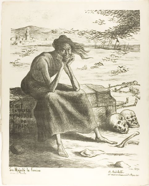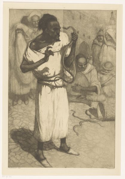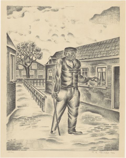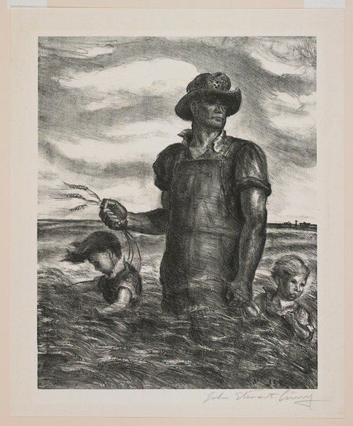 Curator: Editor: So here we have John Wilson's "Breadwinner," a charcoal and print piece created in 1943. It has this striking visual weight, especially in the foreground. The figure dominates the space, but I'm curious about the broader context. What do you see in this work? Curator: What I notice immediately is the materiality – charcoal on paper, a readily available medium, a choice laden with its own history of accessibility and widespread use, particularly within socially conscious art movements. Notice how Wilson utilizes the stark contrasts and rough textures achievable with charcoal to depict the working class. What does the inclusion of the printmaking process suggest about the intended audience and distribution of the work? Editor: That's fascinating. A print could mean wider distribution, making the art more accessible to the community it depicts. Does that say something about the labor of art-making, and who it serves? Curator: Precisely! It challenges traditional notions of art being solely for the elite. This was made during wartime, and in terms of cultural context, it coincides with heightened awareness around labor and social inequities. The artist chose an inexpensive way to reach out to common people to discuss complex issues that involve the working class, such as the fight for sustenance in the modern capitalist urban setting. Editor: So it's less about the aesthetic object itself, and more about its journey and impact. I never considered the social and economical forces inherent in it. The pigeons in the foreground can then be considered scavengers surviving off of industrial waste! Curator: Yes. Thinking materially brings to light the complex interconnected web between the hand of the artist, labor and distribution. By choosing printmaking to depict an image of a person struggling to make ends meet, he underscores the means of its making as well as who gets to access the meaning behind it. Editor: That perspective completely reframes how I understand art. I will keep thinking about it moving forward.