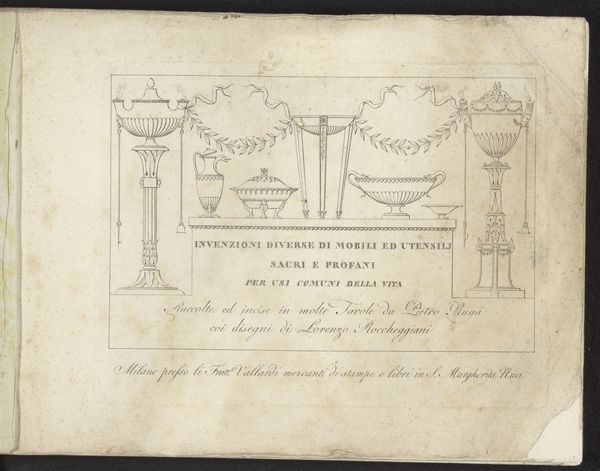 Laurent Guyot created this print, "Vazen en arabesken," using etching, a process where lines are incised into a metal plate with acid, and then filled with ink to transfer the design to paper. The delicate lines and ornate details evoke the luxury and refinement of 18th-century French decorative arts. Notice how Guyot meticulously renders swags of foliage, classical vases, and arabesque patterns, showcasing the skilled craftsmanship valued during this era. This aesthetic was highly sought after by the elite, reflecting their wealth and taste. Prints like these functioned as design resources. Artisans would adapt the designs to create wallpaper, textiles, and furniture. The skilled labor involved in producing these luxury goods highlights the economic structures of the time, where fine craftsmanship was both celebrated and relied upon. By examining the materials, production techniques, and social context of works like this, we gain a deeper understanding of the values and priorities of the past, blurring the lines between art, design, and craft.