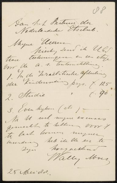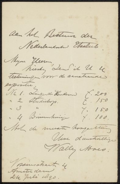 This is a letter, penned by Martinus Kramer, likely dating back to the late 19th or early 20th century. The letter’s contents and tone offer a glimpse into the art world of the Netherlands and the financial transactions involved. The document lists several locations, each associated with a price in francs, alongside the title “Le rebul. Hollande Pittongue”. The mention of specific places like Rotterdam and The Hague, along with monetary values, underscores the economic aspects of artistic exchange. It invites us to think about the social conditions that shape artistic production. Was Kramer corresponding with a patron, a dealer, or perhaps another artist? Further research into the Dutch art market, and financial records of the period would help us understand the relationship between artist, subject, and patron. Such investigations bring us closer to understanding the social and institutional contexts that shaped Kramer’s work.