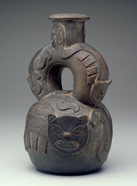 Editor: Here we have a ceramic Stirrup Spout Vessel with Raised Chimera Motifs made by the Moche culture, sometime between 100 and 500 CE. The smooth, dark grey surface is compelling, almost metallic in appearance, and I’m drawn to the raised animal figures on the body. What stands out to you about this piece? Curator: I’m interested in how this vessel collapses the traditional divide between art and craft. This wasn’t just decorative; it was a utilitarian object. Considering it was made of ceramic, the process involved extracting raw materials from the earth, shaping them, firing them – a real labor-intensive process. How does that materiality and production influence our understanding of Moche culture? Editor: It's amazing to think about where the materials came from, and the effort involved in creating it so long ago, particularly considering they didn't have modern tools. Did the kind of clay they used have a symbolic meaning? Curator: Potentially. Access to certain clays could have been controlled, adding social significance to the final product. Moreover, the fact that the chimera motifs are raised tells us that molds or complex carving techniques were involved, which might denote specialization of labor and perhaps even social status for the artisans. It also encourages us to think about trade and access to materials beyond their immediate environment. Does the depiction of the chimera give you insights into their values? Editor: Yes, representing hybrid creatures might symbolize power, spirituality, and perhaps even stories specific to their communities. I see what you mean about labor, materiality, and social context—it completely shifts how you view this ancient piece. Curator: Exactly! And recognizing that shift in perspective shows how looking at production processes helps us move beyond simply admiring aesthetics. It also reveals complex interplays between labor, resources, and cultural meaning. Editor: Thank you; it's fascinating to consider art in that way. It really opens up a deeper appreciation.