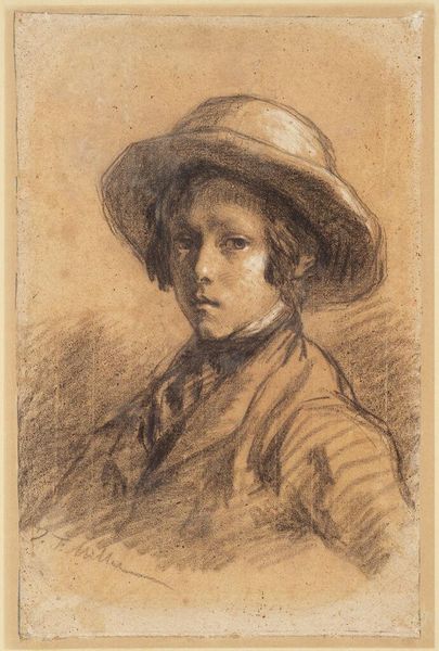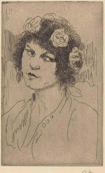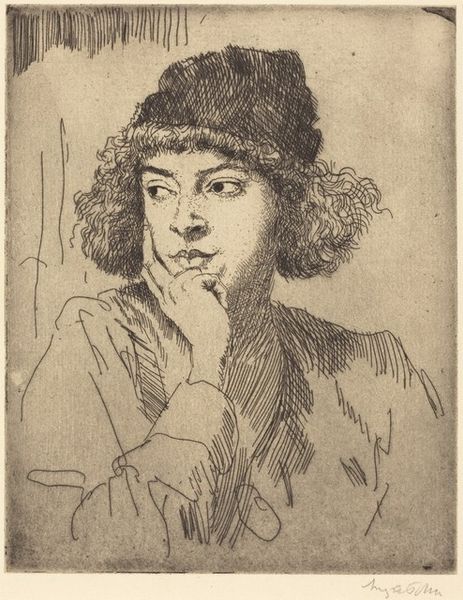 Editor: So here we have Augustus John's etching, "A Girl's Head - E," likely from 1919. There's a wonderful, almost melancholy feel to it, and you can see how the etching really brings out the details in the subject's curly hair. What strikes you most about this piece? Curator: The intimacy, I think. The scratch of the etching needle feels like a whispered secret, doesn’t it? You’re drawn in by her gaze, yet she's somehow distant. I wonder what she’s thinking…Perhaps reflecting on the changing world after the Great War? This was a time of huge social upheaval and change for women. What do you make of the rather frenetic background lines? Editor: That's a great point about the post-war period. I hadn't really connected that to her expression. As for the background, I find the lines a little distracting, but also somehow, very fitting - it mirrors her perhaps complicated inner life. Almost as if what is on the interior is trying to break out. Curator: Yes, and perhaps John felt it important to show that inner life. To me, that hectic hatching breathes so much dynamism into what could have been just another formal portrait. Are we seeing the artist’s inner landscape projected, or the subject’s? Maybe a little of both, entwined…which is what art is about. Editor: That’s beautiful – this idea of intertwined inner landscapes. I initially saw a sad portrait, but now I'm also appreciating this energetic tension, this complexity of emotion. Curator: Exactly! Art isn't always about pretty pictures. It's about sparking a dialogue, a feeling, a question in you…even a little discomfort. And isn’t it delightful when a piece keeps revealing new layers the more you look?