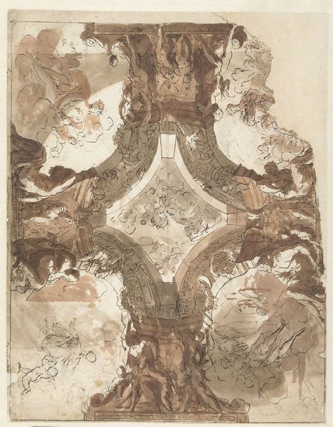 This is Mattheus Terwesten’s design for a ceiling with five mythological scenes, created with pen in brown ink. Terwesten lived through shifting social structures, as the Dutch Golden Age gave way to new cultural influences from France. Consider how the figures, rendered in dramatic foreshortening, are set against a backdrop of swirling clouds and ornate architectural details, alluding to classical mythology. While these scenes might seem purely decorative, they reflect the values and aspirations of the elite who commissioned such works. Who were these patrons, and what did they hope to communicate through these images? The mythological themes, often drawn from Ovid's "Metamorphoses," explore narratives of transformation, power, and desire. Mythological scenes offered a way for artists and patrons alike to negotiate questions of identity. Terwesten uses traditional imagery, yet the emotional depth of the figures invites us to consider the human dimensions of these stories. Through this design, Terwesten invites us to look up and imagine the stories and values that shaped his world.