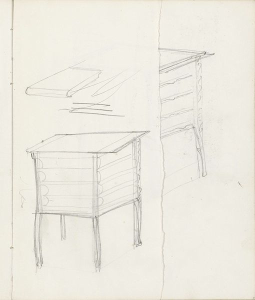 Curator: At first glance, it evokes a feeling of nostalgia—like rummaging through forgotten blueprints in a dusty attic. Editor: We're looking at "Ontwerpen voor een stoel," or "Designs for a Chair," created around 1908 by Carel Adolph Lion Cachet. It’s a pencil and ink sketch on paper, currently housed in the Rijksmuseum. Curator: Blueprints, yes, or architectural whimsy. You can see the ghost of a chair emerging, quite literally in skeletal form. It is interesting how the form is shown from multiple points of view... Editor: Cachet's exploration of form is really central here, isn’t it? It's a symphony of line work. You notice the delicate hatching and the subtle shifts in pressure. He employs varied line weights, suggesting not only depth but also the materiality he's envisioning. Note how geometric shapes ground the chair design, while curlicue adornments on the legs add an air of Art Nouveau playfulness. Curator: There’s something incredibly vulnerable about a sketch. The artist reveals the thought process, and what gets revealed resonates so strongly, as if an echo to our own vulnerabilities. These tentative lines show the making of an idea. You can just see it becoming. Editor: Precisely. The medium itself, the humble pencil and aged paper, speaks to the era's artistic leanings. We see this influence from the Arts and Crafts Movement – a focus on process, intention, design as an inherent expression of craft. He wasn’t just drawing a chair. He was dreaming it into existence. Curator: Absolutely, the idea that everyday objects can be imbued with beauty and meaning...it really invites us to contemplate the artistry embedded in our own daily surroundings. Editor: Looking closely at the structural underpinnings – how he balances the geometric stability with those fluid curves – provides an interesting glimpse into the artist's pursuit of visual harmony. Curator: Makes you wonder about the chair that *could have been*. Perhaps Lion Cachet sat on similar chairs in his house while thinking up new ideas, turning something useful and normal into something unique and amazing through his art. Editor: This seemingly simple sketch invites profound reflections on form, function, intention, and even, perhaps, on the essence of design itself. Curator: Indeed. It nudges you to consider the untold stories hidden within even the most unassuming of drawings.