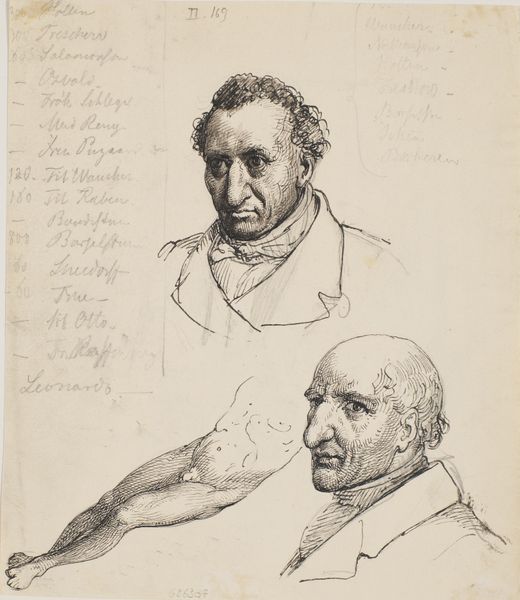 This undated drawing, "Twee profielschetsen van Jan Willem Pieneman, met een tekst van de tekenaar," by Louis Royer, presents us with a study in contrasts, both in form and potential meaning. Executed in graphite, the work immediately strikes one as an exercise in capturing likeness, yet it also invites deeper consideration of representation. Royer employs line with remarkable economy, defining the profiles with a precision that speaks to his skill as a draughtsman. The two figures, rendered in stark profile, invite a semiotic reading: do they represent differing aspects of Pieneman's character? Or perhaps they suggest a dialogue between the public persona, adorned with what appears to be a medal, and a more introspective self. The formal constraints of the profile view, limiting our access to the subjects' faces, subtly raise the question of what remains unseen, or unsaid. The handwritten text below, with its loops and swirls, adds another layer of complexity. It's a reminder that art is not just about what we see, but also about the contexts, intentions, and cultural codes that shape its making and reception.