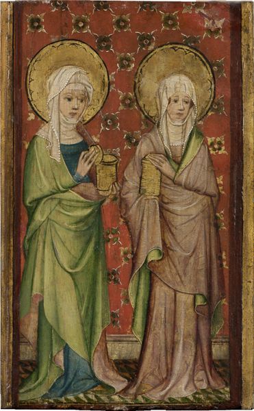 Curator: This is "Geertruy Haeck Kneeling in Prayer before Saint Agnes," an Early Renaissance tempera on panel painting from about 1465, created by an anonymous artist. Editor: The light in this panel! It feels almost dreamlike, the way it softens the edges of everything. And that lamb... isn't it wonderful? There's an earnest quality, both innocent and surreal. Curator: The artist’s handling of materials interests me. Look closely at the panel itself. The early Renaissance relied heavily on egg tempera and gilding to produce such a sheen, yet the depiction of textiles speaks volumes about societal consumption. Consider Geertruy Haeck's devotion staged against luxury items. Editor: Staged, exactly. It does feel constructed, deliberately symbolic. I'm drawn to the pattern on the floor; the repeating design feels like it's pulling me into the image, a little like peering into Geertruy Haeck's devout world, as you pointed out, filled with devotion and worldly things all at once. And, of course, St. Agnes with her beatific calm. She almost doesn't acknowledge the presence of the kneeling woman, more intent on the...well, that's one fluffy lamb. Curator: Yes, consider the economic structures, of even anonymous devotional works like this one. Gilding alone signified access to specific guilds, pigments had costs related to trade routes; therefore even displays of piety were, fundamentally, rooted in material exchange. Editor: Do you think Geertruy was painted from life? There's a striking immediacy to her features. It makes you wonder about her lived reality—about how all of this luxury intertwined with, or even influenced, her spiritual life. That earnest piety coupled with an understanding of status—what a curious pairing! Curator: Such artistic patronage allowed women in the middles ages to commission artwork displaying power or importance, but moreover helped to advance artistic progress using valuable pigments and labor that was not previously attainable. Editor: So, viewing the painting itself becomes a lens through which to explore the material circumstances of its creation. It is humbling to see a 15th-century display of human creativity tied to very concrete exchanges of resources. Curator: Indeed. Viewing such work helps in grasping art not only for its spiritual qualities but the vast means for which creation can be displayed with materiality. Editor: Beautifully put! Thanks for illuminating the ways in which devotion becomes indelibly linked with materiality; for bringing the dreamlike tones down to Earth.