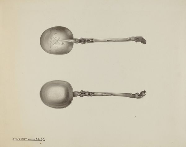 Curator: The quiet simplicity of Kalamian Walton’s “Silver Spoon,” dating back to approximately 1938, is remarkable. The work employs a soft graphite to render two antique spoons. Editor: My first impression is one of muted elegance. The drawing is both delicate and precise—somehow humble, yet the silver seems to glow right off the page. Curator: Indeed. Consider the detail in the bowls of the spoons. The artist's light touch with the pencil creates a convincing illusion of reflective metal. Note also the contrast of the detailed patterning on the handles with the plain background. Editor: And each handle seems to tell a story! Look at the faded inscription on one. It hints at lives, perhaps generations, using this very silverware. It sparks a quiet sense of nostalgia, don't you think? Almost ghostly. Curator: A good point. The spoon becomes a symbolic carrier of history and memory. Observe how the arrangement—one above the other—creates a sense of hierarchy, as if presenting the spoons for study. Editor: It reminds me how everyday objects, like these spoons, often outlive us, bearing silent witness to countless moments. This artwork turns something ordinary into an object of reverence. Curator: Yes. It’s a testament to the power of art to reveal the extraordinary in the mundane. We’re left to ponder the histories embedded within these gleaming forms, rendered so skillfully in pencil. Editor: It makes you want to take a closer look at your own silverware drawer! Maybe there's more lurking there than just cutlery! Curator: Precisely. Walton urges us to reconsider the potential poetry inherent within the things we often overlook. Editor: To recognize that stories exist, even in the humblest of places. A silver lining of reflection.