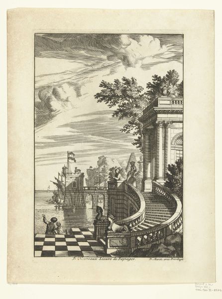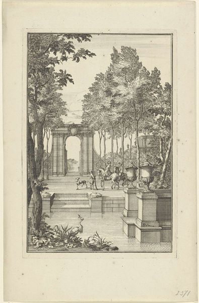 Editor: This is "Gezicht in een laan met een tuinvaas," or "View in an Avenue with a Garden Vase," an etching and engraving by Sieuwert van der Meulen from 1707. The crisp lines and architectural precision create a really formal atmosphere. What stories do you see in this piece? Curator: I see a manifestation of power and control. These meticulously planned landscapes were tools used by the elite to reinforce their dominance. Notice how the architecture and the landscape are completely intertwined, reflecting a desire to tame nature itself. Who benefitted from this taming, and who was excluded from this vision of order? Editor: So, the garden isn't just a pretty backdrop, but a symbol? Curator: Precisely. It speaks volumes about the societal hierarchies of the time. Think about the labor required to create and maintain this idealized view. The artist gives us no glimpse into the lives of the workers, who made such extravagant displays of wealth possible. Editor: It’s unsettling to consider what is left out. But without knowing the social context, one could easily overlook it. Curator: That's why it's so important to examine art with a critical eye, thinking about whose stories are being told, and whose are being erased. The beauty can distract us from deeper inequities, which is the perfect, subtle propaganda. Editor: I will certainly look closer in the future. It’s helpful to consider that art may actively work toward some ideology. Thank you! Curator: My pleasure. Art offers us not only a view of the past, but also a lens for understanding our present and agitating for change.