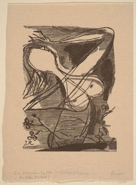 Editor: This is James V. Harvey's 1949 print, "Convulsion." The lines are so active, almost violently interwoven. It really feels like some kind of internal struggle. What do you see in this piece? Curator: It's fascinating how the title itself, "Convulsion," prepares us to interpret the visual language of disruption and unrest. Note how Harvey divides the composition into distinct sections, but uses swirling lines to unify them. Do you think those shapes appear purely abstract, or could they hold a deeper significance? Editor: I initially saw just abstract shapes, but the more I look, the more I feel like they're hinting at something organic, maybe even bodily. Curator: Exactly! Think about the word “convulsion.” It often refers to a violent, involuntary contraction of the muscles. Do the geometric and biomorphic forms possibly echo that physical turmoil? It resonates on multiple levels. I am also intrigued by the lines. It's a dance between rigid structures and free-flowing expression. Perhaps mirroring our cultural moment where society still faced strict post war-constraints and emerging personal freedoms. Editor: So, you’re suggesting it might reflect tensions beyond just the personal or physical, like maybe even social anxieties of the time? Curator: Indeed. Visual symbols are always entangled with the cultural memory of their moment. Look at how Harvey is both embracing and challenging traditional notions of form, hinting at a shift in artistic consciousness. It seems like a reflection of psychological explorations taking hold at the time, as well. Editor: I hadn't considered how much the title shapes the interpretation. Now I see how it transforms what might be purely abstract into a loaded, emotional image. Curator: And the limited color palette emphasizes the line and form. A stripping away to essential feelings. The way artists visually interpret events certainly impacts their historical representation. It is as important to understand form, style and execution as it is the historical moment. Editor: Absolutely, now I see “Convulsion” isn’t just about shapes—it is speaking of so much more. Thanks for shedding light on the piece!