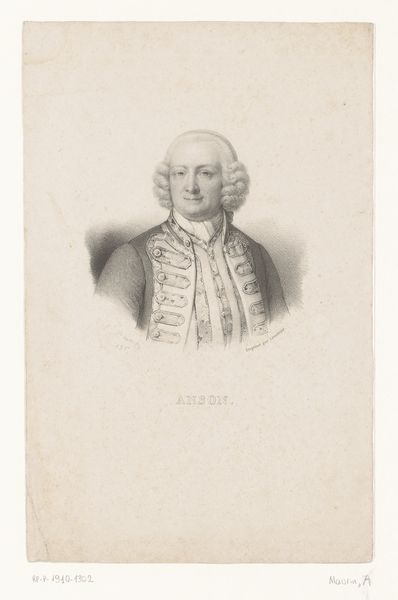 Editor: This is an engraving from 1833 by Antoine Maurin, a portrait of Admiral George Anson currently held in the Rijksmuseum collection. It's fascinating how Maurin captured such detail using engraving techniques! What first strikes me is its formal, almost stately, quality... how would you interpret this portrait? Curator: Stately indeed. Imagine Anson himself, a figure navigating both treacherous seas and the even trickier waters of courtly intrigue! The classicist style and the engraving medium itself lend an air of authority and permanence, don’t you think? The almost obsessive detail in his uniform, those rows of buttons—they speak of order and hierarchy, a visual language of power. But look closer, Editor. Editor: At his face? Yes, there’s a definite contrast. It's softer, more human. Curator: Precisely! The engraver captures a hint of weariness, a touch of vulnerability. Perhaps a suggestion of the burdens of command? It’s like a fleeting glimpse behind the carefully constructed façade. What do *you* feel when you observe him? Editor: I feel… a little sympathy, maybe? I initially saw this image as simply a historical record but considering him as an individual adds another layer to it. Curator: And that’s the magic, isn’t it? The artist invites us to look beyond the surface, to connect with a person across the vast gulf of time. Art gives us a portal, Editor. Even to Admirals of the 18th Century! What do you make of it all now? Editor: That's beautiful - thank you for showing me that the cold austerity hides a human being, and it’s now that element of the piece that strikes me most.