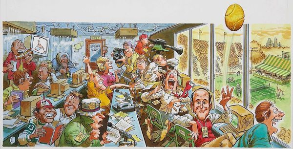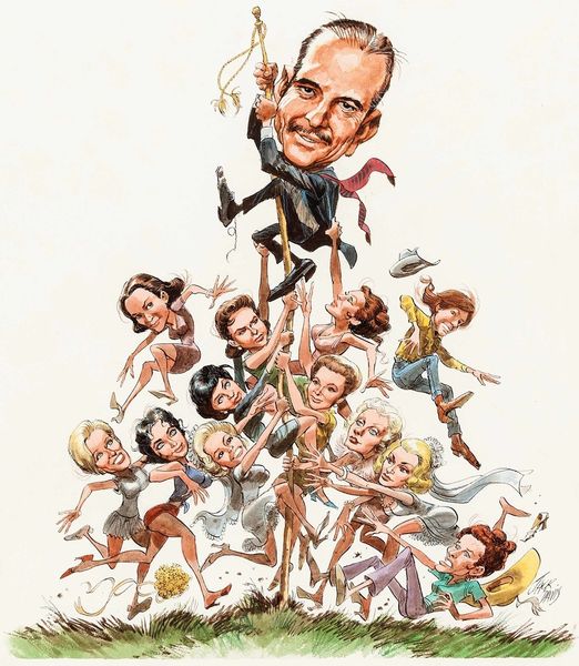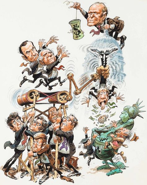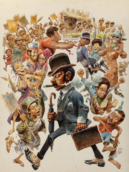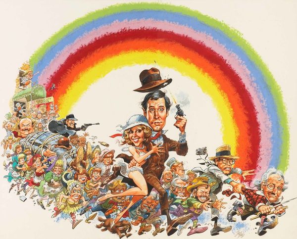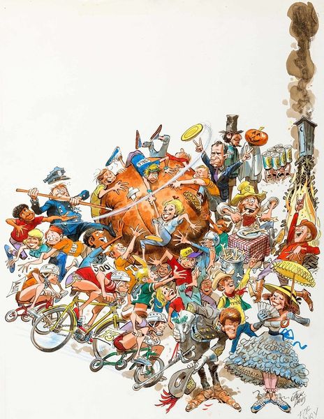 Curator: "One More Time!", a riotous oil painting from 1970 by Jack Davis. What's your first impression? Editor: My first thought is—this is a very strange party. The overall effect is dynamic chaos. It’s difficult to absorb everything in one viewing; the image seems restless, overflowing with caricatures and satirical imagery. Curator: Absolutely. Davis was celebrated for his illustrations for *Mad* magazine, album covers, and movie posters. In this work, the central figures are Sammy Davis Jr. and Lorne Greene, surrounded by characters representing various stereotypes and genres of the time. Look at how those archetypes of popular entertainment vie for attention. Editor: It seems significant to think about its manufacture as a carefully crafted composition despite the frenetic imagery. Given his work on popular publications and films, there is perhaps an emphasis on efficiency in how this was created. Were there many studies, sketches, or did Davis work at high speed to churn out the illustration? What sort of support system of labor enabled this? Curator: The stereotypes themselves feel weighty, each bearing decades of baggage. For instance, the exaggerated depictions of cowboys and native Americans carry a very loaded history and symbolism rooted in conquest and the American West. It begs the question: what commentary, if any, is Davis offering through this cacophony? Editor: I'd suggest this kind of commission really exemplifies the blurring of high and low art production in the twentieth century. Illustration often ends up ignored by those invested in notions of ‘fine art’ but I find it intriguing when that boundary gets challenged or completely demolished by these types of artistic projects. Curator: Seeing all of these archetypes jumbled together makes me consider the notion of nostalgia itself. Are we meant to long for these genres, critique them, or laugh at their absurd combinations? Is Davis interested in cultural memory and what persists in the collective consciousness? Editor: From a materialist position, it shows how various elements of production such as comic-like line work are combined to produce a singular finished product consumed at scale, whether in print, as a poster, or projected onto an album cover, creating something totally unique through mass manufacturing and consumption. Curator: That said, these archetypes don't simply vanish. These symbols evolve and appear "one more time" through later interpretations, whether deliberately or accidentally, informing how we create new stories and understand the world. Editor: Indeed. Thinking about this piece highlights how much the conditions of production influence meaning and visibility, prompting discussions about the art market, the social implications of manufacture, and circulation of mass media.