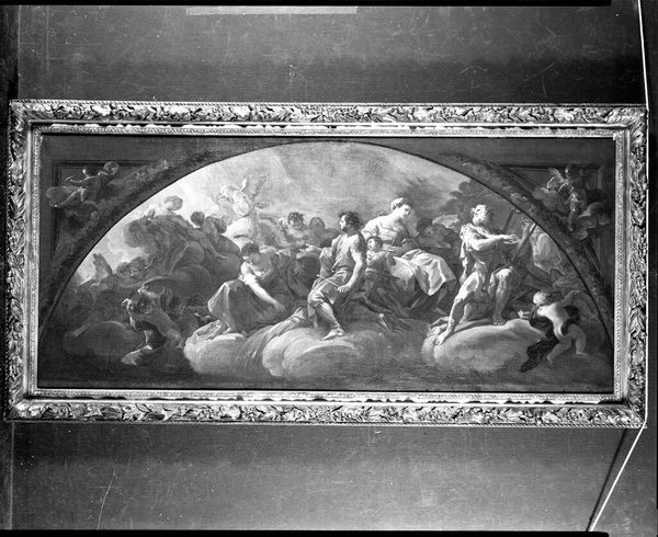 Editor: This striking oil on canvas, "Mythological Scene," comes from the studio of Giulio Carpioni. I’m captivated by how the artist uses this oval frame to create a sense of dynamic movement. What stories or symbols do you see unfolding? Curator: I see a whirlwind of bodies, a literal descent of gods, perhaps. The figures pointing upwards, reaching, evoke a longing for the divine, a yearning present in many classical myths. What feelings do those gestures awaken in you? Editor: There's a sense of chaos and desire, but also a hint of drama. Do you see a particular narrative here? Curator: The narrative is less important than the enduring symbolism. Gods intervening in human affairs, mortals aspiring to transcendence - it's a recurrent theme in Western art, reflecting humanity's complex relationship with power and mortality. Editor: That’s fascinating. I hadn't considered how those themes continue to resonate today. Curator: Indeed. Symbols like these echo across centuries, reminding us of shared stories and enduring questions.