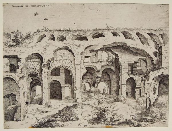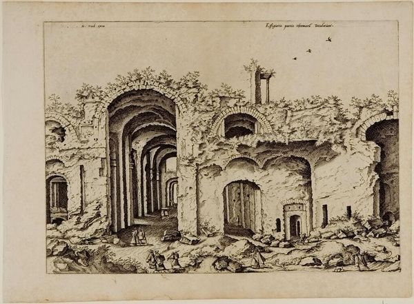 Curator: Here we have "Third view of the Baths of Diocletian," an engraving dating from sometime between 1561 and 1600, attributed to Johannes or Lucas van Doetechum. It depicts a panoramic view of the ruined baths. Editor: My initial impression is one of monumental decay. The crumbling arches and overgrown stonework speak volumes about time's relentless march and the impermanence of even the grandest structures. There’s almost a romantic melancholy in the air. Curator: Indeed. This piece encapsulates the Mannerist fascination with antiquity, a longing for a lost Golden Age. Note the human figures interspersed amongst the ruins. They're dwarfed by the scale of the architecture, perhaps suggesting humanity’s fleeting existence compared to the enduring legacy of empires. The architectural ruins serve as memento mori. Editor: From a formal standpoint, the engraving displays remarkable skill in rendering texture and depth using only line work. The varying densities of hatching and cross-hatching create a sense of light and shadow, adding dimension to the ruins. I am also intrigued by the composition, which leads the eye through the arches to the implied vastness within. Curator: Consider, too, the cultural significance of the Baths of Diocletian themselves. They represent Roman engineering prowess and a particular lifestyle centered around public bathing and leisure. By depicting them in ruin, the artist subtly comments on the decline of Roman civilization and perhaps on the cyclical nature of history itself. Those arches are symbolic gateways to past and present. Editor: Absolutely. The overgrown foliage also contributes to this sense of reclamation by nature, of something grand returning to the earth. There's a palpable tension between order and chaos, structure and disintegration. Curator: These layered meanings within the seemingly simple scene is quite revealing. What appears at first glance to be merely an architectural depiction quickly opens into a complex commentary about time, legacy, and the impermanence of power. Editor: And from a purely aesthetic point of view, it’s simply a beautiful and evocative piece of art. The use of line and shadow creates a compelling image, and makes for a compelling visual experience even divorced from any knowledge of the subject. Curator: Agreed, there are still things to be discovered, even with repeated viewings. Editor: A fitting meditation on ruins, isn't it? We find meaning even within destruction.