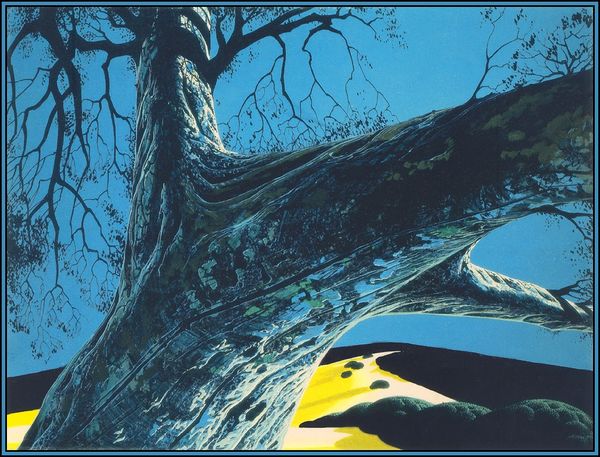 Curator: Standing before us is “Mustard Field”, a painting by Eyvind Earle. Earle, though we don't have a specific creation date for this piece, became known for his distinctive style and work with Disney as a background artist for “Sleeping Beauty.” Editor: The color palette is what immediately grabs me. That almost overwhelming, vibrant green creates a somewhat surreal, dreamlike field. It certainly clashes with the dead looking tree in the foreground, which somehow only adds to its strangeness. Curator: Yes, the vibrant green, symbolic of growth and renewal, paired with the stark, almost skeletal tree introduces an interesting tension. Note also Earle’s signature stylistic lines; the way he defines the landscape and even the foliage itself is almost graphic. Editor: Right, those lineworks feels intentional and constructed rather than free. But there's also a strong element of folk art in the almost naive presentation, which offers a stylized take on nature. The rounded canopies of those distant trees for instance—they're like perfect, almost symbolic circles. Curator: And if we delve into those rounded forms and consider them more deeply, we might perceive the archetypal symbol of wholeness, often associated with idealized concepts of nature within early modernist movements. This sort of idealised and aesthetic understanding of landscapes really flourished from the 60's. The social awareness was reflected through landscape artworks. Editor: Interesting, so perhaps there's a kind of underlying social commentary in the stylization and almost artificial perfection presented here. It's an oddly captivating vision—part appealing, part unsettling. Curator: Precisely, that tension, combined with the formal stylization is why it's so interesting from a historical perspective. Earle’s works exemplify how ideas of landscape and nature reflected larger cultural shifts, through a blend of romantic idealism with highly controlled and precise imagery. Editor: Indeed, a piece that invites closer inspection. Thank you for drawing out those cultural implications—it certainly makes this visual space all the richer.
