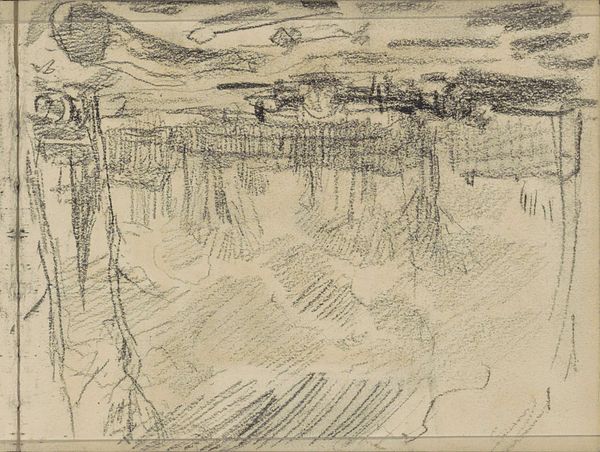 Editor: We're looking at Johan Antonie de Jonge's "Duinlandschap, mogelijk met de watertoren te Scheveningen," a pencil drawing, likely from sometime between 1884 and 1927. It has a raw, almost fleeting quality to it. The wind seems to blow right off the page. What strikes you about this piece? Curator: Fleeting is right! It's like catching a thought on the wing, isn't it? This isn't about capturing every blade of grass; it's about capturing the *feeling* of the dunes. You can almost smell the salt air. And see that little water tower lurking in the background? It anchors the sketch, gives it a specific place, yet the rest… the rest is pure impression, like a dream half-remembered. Do you feel that De Jonge communicates depth even in such a seemingly simple work? Editor: Definitely. The shading, the way the lines fade in and out…it creates a sense of distance. It's looser than I expected, and very atmospheric, like it captures not just a place but also the weather of the place. Why just use pencil though? Curator: Perhaps that's the charm. Pencil is immediate, personal. Think of it as the artist’s intimate conversation with the landscape, unfiltered, immediate. If this was the genesis of something grander? A moment caught, then set free. What feelings emerge as you linger longer in De Jonge's world? Editor: A sense of calm. Of vastness, too, maybe. Like I’m standing right there, feeling the wind in my face. It is very transportive! Curator: Yes. A little whisper of a memory. See? Sometimes, it's the simplest things that speak the loudest. I like it. A lot. Editor: I agree. There’s beauty in that simplicity, in the suggestion of a scene, leaving space for our imaginations to wander through those dunes.