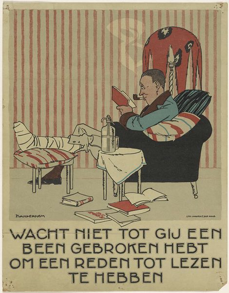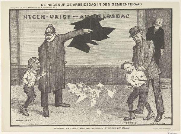 Curator: Ah, yes, let's consider this lithographic poster "Affiche voor kinderboeken van Daan Hoeksema," likely created between 1894 and 1918. The graphic arts, particularly Art Nouveau aesthetics, clearly define its design. Editor: My first impression is unease. There’s something unsettling about the oversized, shadowy figure lurking behind the police officer and child. It speaks to a deep societal anxiety around the vulnerability of youth and the pervasive nature of temptation or vice. Curator: Observe how the composition reinforces that feeling. The flattened perspective, combined with the use of strong outlines and contrasting colours – mostly brown, gray and black– creates a striking image that draws your eye immediately. Editor: Right. And look at the inscription at the top. "Ledigheid is des duivels oorkussen." "Idleness is the Devil’s pillow." Suddenly the lurking figure isn't so abstract. It becomes the personification of laziness and its dangerous consequences. We must consider what this artwork is telling us about attitudes of this time. Curator: I would rather see how Hoeksema used simplified forms and bold patterns to communicate his message. The way he reduces the forms of the policeman and the boy to essential silhouettes gives the work an almost emblematic quality. Note especially how each object's purpose plays in with the rest, as semiotic evidence of Hoeksema's genius! Editor: Maybe, but also remember this was the turn of the century – a time of immense social upheaval and burgeoning anxieties surrounding morality and proper behaviour, particularly regarding the young. This is a very on-the-nose message using symbolism, likely about shaping young minds. Curator: Of course. Nonetheless, consider the formal arrangement... This clever distillation of complex themes into visual terms of this type, which offers insight into Dutch artistic techniques during this exciting moment in Art Nouveau, remains interesting. Editor: Indeed, analyzing it like this, we uncover how graphic design could then reinforce cultural ideologies and beliefs. The artwork isn't just aesthetically compelling; it acts as a cultural mirror, reflecting its contemporary moment. Curator: Precisely! A fine demonstration, I dare say, on how artistic genius presents the past! Editor: And it offers an unsettling reminder about persistent cultural battles that have shaped perceptions about childhood innocence.