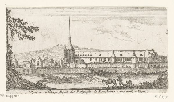 Editor: This is "View of the Church of Flavigny-sur-Ozerain" by Israel Silvestre, an etching from 1650, housed at the Rijksmuseum. I’m immediately struck by the contrast between the imposing church and the everyday activity in the foreground. What stories do you think Silvestre is trying to tell? Curator: Silvestre’s etching operates on multiple symbolic levels. Note the prominent position of the church and cross – not just architectural features, but potent emblems of faith and spiritual authority. The procession of figures, some carrying spears, isn’t merely a snapshot of daily life; it possibly alludes to the cultural memory of pilgrimages, the intersection of secular life with religious practice. What emotional weight does the spire, piercing the sky, hold for you? Editor: I see it as aspiration, a reaching for something higher, maybe even a defense? Curator: Precisely! It could represent protection and a reminder of faith’s unwavering presence. Think about the role of religious buildings in that era - visual declarations of power, community, and permanence. Silvestre, through etching, isn’t just showing us a cityscape; he's revealing the town’s identity through deeply rooted symbolism. Are there any specific figures or details that pull your focus? Editor: I keep returning to the armed figures in the center; their presence adds a layer of unease to the serenity of the scene. It seems there is tension, the town could be threatened, in danger. Curator: Yes, that friction—between peace and potential conflict, the earthly and the divine—is essential. They subtly disturb the idealized serenity and create a powerful historical and psychological portrait. Seeing Flavigny through this etching enriches my understanding of how sacred spaces defined life back then. Editor: I agree, reflecting on these embedded symbols allows me to go beyond a surface level viewing and explore narratives within art.