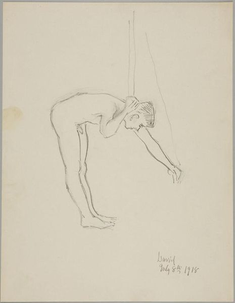 Curator: Let's explore this intriguing drawing by Mark Rothko: "Seated Female Nude Facing Right, Head Turned Left." It's a pencil sketch portraying a nude figure. What are your initial thoughts? Editor: The economy of line is striking. There’s a sparseness, an almost tentative quality, despite the confidence suggested by the overall composition and how she's comfortably leaning into the gesture of sitting on the floor, it projects calm. Curator: Indeed. It's a nude, a common subject historically, but I think Rothko invites us to consider the female form beyond traditional, often objectified, representations. What could a nude by Rothko signify, considering his later, better-known abstractions? Does the pose give any hints about the model or their disposition, beyond that they appear at ease? Editor: Well, look at the rendering of light and shadow. The shading suggests depth and volume but feels less about pure anatomical accuracy and more about creating a sense of spatial relationship. There is tone in the piece. The lines have real heft, a quality that almost lends it weight. The gaze of the model would likely further add meaning and context, but her face is obscured with hatch marks, removing details, so one cannot deduce such ideas about this figure. Curator: Perhaps. The ambiguity is central, a conscious move. Rothko strips away the personal, societal associations. What remains, and perhaps what he’s aiming for, is pure form and the inherent complexities of the female form, a meditation on identity itself, as explored by art historian Anna Chave when she examines the artist's wider output and trajectory through American history. It may give a voice to many subjects across art history, rather than just a single, potentially fetishised image. Editor: An interesting observation. While I see those interpretative avenues, for me, the drawing pulls in my eyes in various vectors of implied lines in all directions through the figures body and use of cross hatching. My engagement is purely on line and shadow; shape and balance, creating something complete in it's minimalist approach. The paper too; it suggests something classical, or aged even; an intriguing mix, for an artist mostly famous for non-representational art. Curator: Precisely, it demonstrates how even his earlier figurative works presage the concerns of his later abstractions. The human figure as a site of emotional and intellectual exploration. It shows a lot about his practice that he's thinking about how it is read and viewed, considering how it reflects through various readings and intentions throughout art history, where we all stand to learn from. Editor: Agreed. It reveals much about Rothko’s early artistic explorations. A fascinating piece when viewing the totality of his artistic evolution.