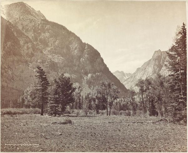 Editor: This landscape, "Valley Near Wangam, Kashmir" by Samuel Bourne, is a vintage photograph. I’m struck by the way the distant fields seem to be meticulously cultivated, like a textile pattern. How do you see the hand of labor reflected here? Curator: Look closely at the photographic process itself. Bourne, working in the 19th century, used the laborious wet collodion process. Consider the material constraints: transporting chemicals and equipment to remote locations like Kashmir. Editor: So, the image itself becomes a document of that physical effort? Curator: Exactly! The photograph isn't just a representation of the valley; it's evidence of a specific interaction with the land, a colonial gaze mediated by material and technological demands. Editor: That gives me a completely new perspective on landscape photography. Curator: Indeed. Thinking about the social and material conditions of production truly reframes our understanding.