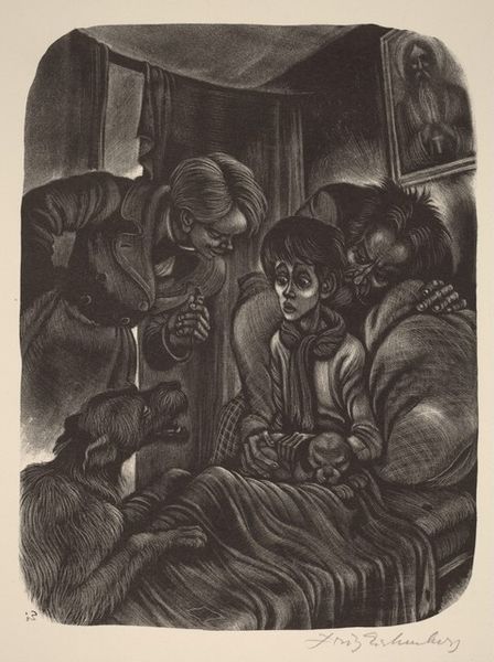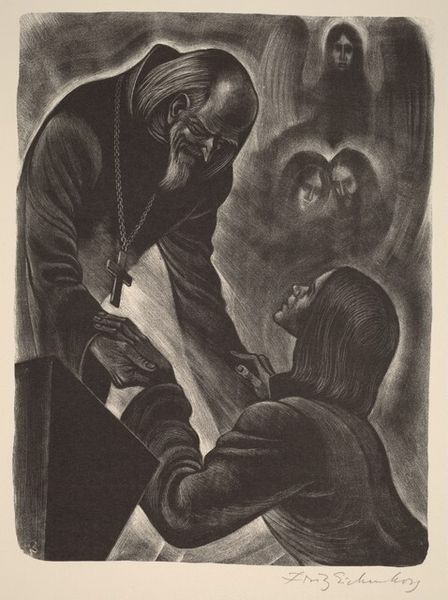 Fritz Eichenberg created this wood engraving, "Drink to the Gates of Paradise," as an illustration for Dostoevsky's *The Brothers Karamazov*. I see a process of careful building, stroke by stroke, to create light and shadow. It reminds me of the kind of obsessive mark-making that I go in for, like a form of meditation. Look at the way Eichenberg uses the black ink on white paper to create the illusion of depth and texture. The light seems to emanate from within, highlighting the figures' faces, drawing you into their emotional world. I notice the way he varies the density of the lines to create subtle gradations of tone. There is a real density to the mark making in the figures clothing that creates a somber mood and a feeling of despair. Eichenberg's work shares with artists like Käthe Kollwitz a concern for social justice and a deep empathy for human suffering. But in the end, art is an ongoing dialogue, always questioning, always searching.
