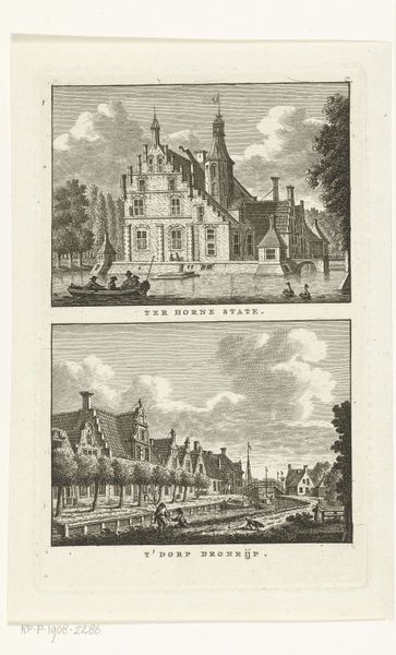 Editor: We’re looking at "Twee stadsgezichten te Utrecht: Mariaplaats en Lutherse kerk," or "Two City Views of Utrecht: Mariaplaats and Lutheran Church," by Carel Frederik Bendorp, made sometime between 1786 and 1792. It's a print made using etching. It feels very… orderly, doesn’t it? A little stiff. What catches your eye about it? Curator: Stiff perhaps, but charming too, like a meticulously arranged dollhouse. For me, it's the light. See how it gently caresses the buildings, especially in the Mariaplaats view? It's almost theatrical, highlighting the everyday rhythms of the city. And those tiny figures! Each one feels like a miniature actor on a carefully constructed stage. Does the presence of those diminutive figures make you wonder about their stories? Editor: I hadn't thought about it that way, but you’re right. They do feel staged. It's interesting you mention the light; now I notice how different the lighting is in the two views. The Lutheran Church scene is much flatter. Curator: Exactly! The upper view practically vibrates with life, while the lower feels more… reserved, perhaps? Could this be intentional, reflecting different aspects of city life, the bustling square versus the quieter church district? Editor: Maybe! Or maybe the artist was just better at capturing light in the first one! It definitely draws my attention more. Curator: Haha! A fair point. Maybe it tells us something of Bendorp's personal fondness. Do you think these neat orderly images could have been made from observation only, or something else informed these depictions of Utrecht? Editor: Hmmm… Perhaps these were made from preliminary sketches or preparatory drawings… Curator: Ah, a very strong and intuitive guess. A print is typically the end product. What did you think of it? Editor: I see it in a completely new light now, thank you!