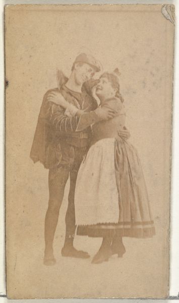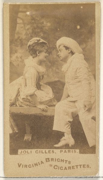 This small photographic print of actors Georgie Drew and Sadie Kirby was made as an advertising card for Old Judge Cigarettes, sometime in the late 19th century. Produced on a miniature scale with industrial methods, its original purpose was not high art, but mass consumption. Printed on thin paper stock, the sepia-toned image is a reminder that photography itself became a mass-producible medium during this period. Consider the labor that went into making these cards; from the factory workers operating printing presses, to the tobacco pickers, to the actresses and studio staff required to pose for the photograph in the first place. The image presents the actresses in costume. Note the texture and form of their garments, translated into monochrome by the printing process. What was once colorful and vibrant on stage, now becomes a study in light and shadow, texture and pattern. This card reminds us that images, like all objects, have a material reality, and exist within complex social and economic systems.