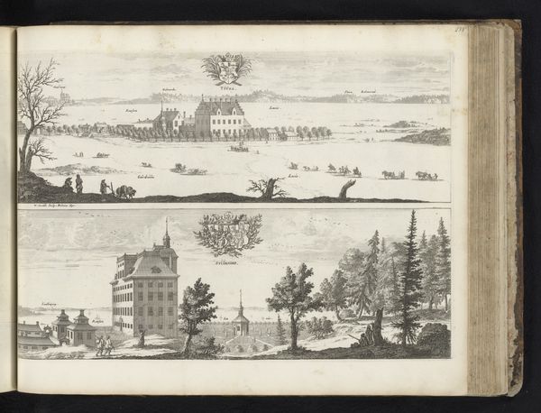 Curator: Here we have a print dating back to 1668 by Adam Perelle, titled "Fountain with a Triton and the rock of Andromeda in the park at Ulriksdal Palace." It’s currently held at the Rijksmuseum. Editor: It has a surprisingly serene feeling to it. Even with all the minute detail—look at how delicate the line work is. Curator: It exemplifies Baroque aesthetics in its depiction of grandeur. This print served a vital function back then; it was documentation. These elaborate gardens reflected power and taste, demonstrating how royalty shaped and dominated both nature and the public's experience of it. Editor: Yes, but that dominance takes the form of very structured compositions. See the balance between architecture and landscape in the upper image, echoed by the layout of the park itself, mirrored in the lower part showing the "rock of Andromeda". Each element holds equal weight in the overall picture. Curator: Precisely. Places like Ulriksdal Palace were cultural stages. This image presents a narrative of Swedish power for the elites. Imagine how the experience would be curated for guests, even those less privileged; even they would find themselves controlled through structured spectacle. Editor: Even without knowing all that, you feel the artifice; nature doesn't create spaces this symmetrical or carefully composed. Look how each tiny figure is placed and arranged in small groups—they are small and uniform. The lines force us to absorb not just a view but an order imposed upon a chaotic world. Curator: Do you see any contemporary commentary? Probably not. But Adam Perelle has undoubtedly secured the king's desired message, contributing to the persona of an orderly and controlled kingdom. This type of engraving had its place in a much larger propaganda machine. Editor: Whether propaganda or not, it masterfully marries geometry with a certain romantic idea of the ideal landscape; everything has a precise place in this printed vision of Swedish paradise. Curator: When looking at an artwork such as this, consider its purpose. How were such images used and circulated and how does the very act of distributing visual representations of power affect culture and society? Editor: And while bearing in mind its purpose and message, it's fascinating to consider how formal aspects of the work impact our perception of the portrayed scenery and society in this place and time.