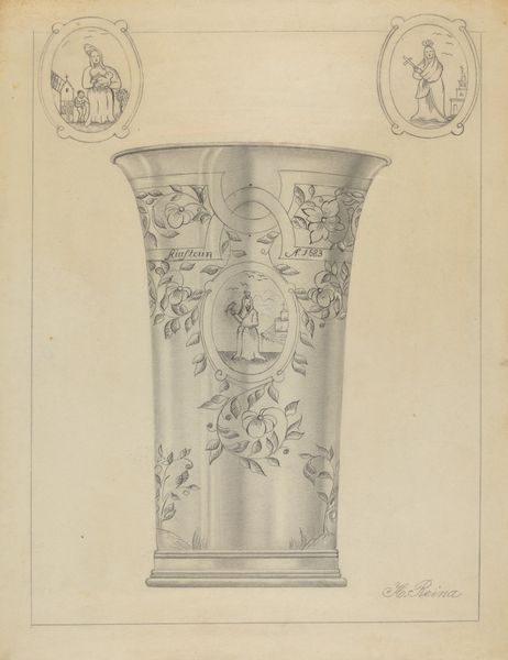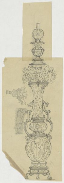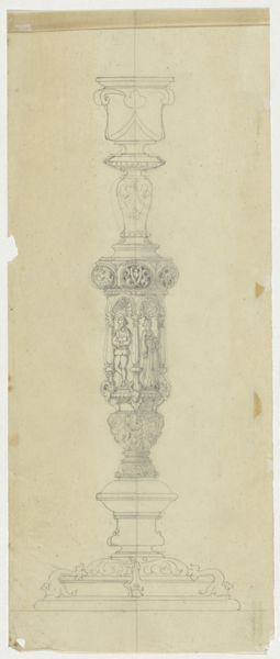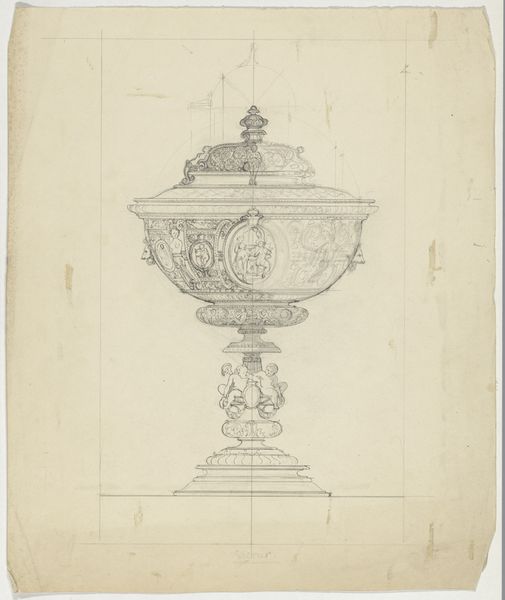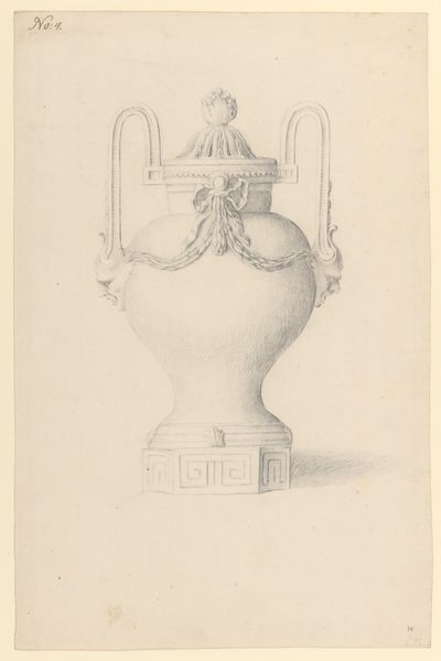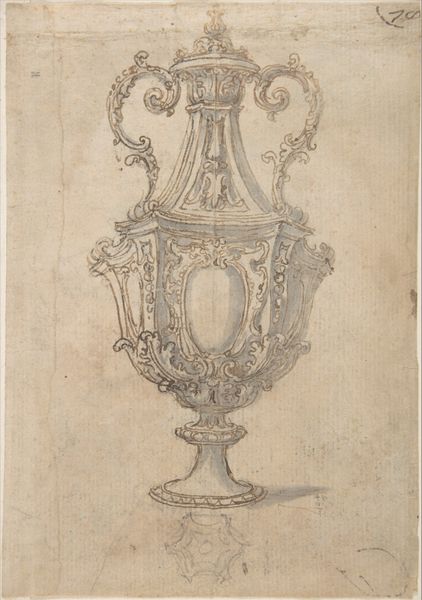 Curator: Here we have John Downman's "Antique Monumental Vase," created around 1774. It's a striking drawing, utilizing ink, pen, chalk, and colored pencil on paper. Editor: My initial reaction is one of awe at the meticulous detail. The symmetry is beautifully rendered, even within this sketch-like quality. There's a certain restrained elegance, a quiet grandeur, emanating from the page. Curator: It’s fascinating to consider this work through the lens of artistic labor and access to resources at the time. Downman, part of the Neoclassical movement, would have been deeply engaged with reproducing classical forms. Editor: Exactly, and look how he's meticulously constructed form through line. The interplay between light and shadow, created with simple chalk and pen, gives such volume and depth to this idealized object. The vase commands space on this plane through clever arrangement of tone and texture. Curator: The drawing hints at the cultural value placed on classical antiquity. Consider also the network of craftspeople and workshops required to produce the original vase. A drawing like this may have served multiple purposes, from documenting existing pieces to prototyping new designs. It gives insight into the division of labor within artistic production in the 18th century. Editor: I agree; beyond the production aspect, there's something inherently pleasing in his dedication to proportion. The curve of the vase, the placement of handles, everything flows toward this divine symmetry. It invites us to look, examine and reflect on perfect balance, that human longing for order amid the chaos of existence. Curator: Indeed. The work challenges us to see past the aesthetic appreciation and delve into the social, cultural, and economic context that made such a piece possible, shedding light on both artistry and industry. Editor: It is through our divergent perspectives that art pieces such as these can achieve full and rounded understanding. Curator: A perfect fusion of beauty, form, and cultural interpretation that deepens our appreciation.