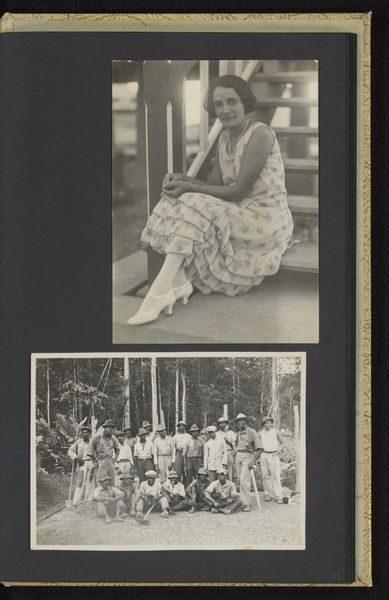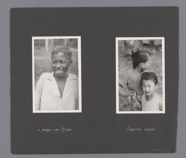 Curator: Here we have a gelatin silver print from the 1930s entitled "Eiland-bewoners," capturing portraits of island inhabitants. I’m struck by its documentary style. What do you notice first? Editor: The contrast. The severe monochrome flattens the space, and I can’t help but think about the hands that developed the photograph and the socio-political circumstances they were in. There are two portraits included, a close-up of a smiling woman, and a larger, group shot. Curator: The photograph really hinges on that opposition you noticed; the bright singular figure isolated versus the shadowed density of the assembled island community. There’s also a kind of flattening effect. It’s an intimate portrait of a woman presented alongside the communal portrait of the island’s social structure. Editor: Absolutely, and those social structures were, undoubtedly, impacted by colonial forces. Looking at the clothing, one has to wonder about the textile production, and the global exchange of goods in the early 20th century. Was the cloth locally sourced, or was it imported? That speaks volumes about the community's economy. Curator: A provocative consideration. The work, as an object, invites reflection upon how the very material conditions of image-making become implicated within broader social relationships. Its realism invites us to probe for deeper contextual significance. Editor: And let's not forget the photographer’s labor. Why did they take these pictures? For whom were they intended? It's easy to get lost in formal aesthetics and lose sight of these power dynamics. Curator: Perhaps. Still, I think that its aesthetic arrangement asks us to also interpret the visible structures and signs to unearth meaning. The tension between light and dark, figure and ground are all at play. Editor: For me, I always ask "Who benefits?" Whose narrative is privileged in this portrayal of island life, especially given its original moment of production and consumption? Curator: Ultimately, the strength of "Eiland-bewoners" resides in how its formal design opens paths for contextual inquiry. Editor: I see this photograph less as an isolated object, and more as a material artifact shaped by broader political currents and the specific choices involved in its making.