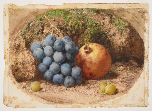 Curator: Look at this lovely still life! It’s "Still Life with Fruit" by William Henry Hunt, painted sometime before his death in 1864. Editor: Immediately, I’m struck by the almost melancholic stillness, the somber grapes contrasting with the oddly bruised lemon, all nestled on a mossy stage. Curator: Hunt was part of a movement that valued truthful depictions of nature. Still life became a way to explore light, texture, and form. Editor: It feels so tangible, the way he renders the skin of that lemon and the bloom on the grapes... almost like a miniature theatre of decay. Curator: His technical skill made humble objects—a simple lemon, some grapes—worthy of contemplation. Editor: Right, it elevates the everyday, reminding us of the transient beauty in ordinary things. I wonder what Hunt was saying about society through his focus on the humblest fruit. Curator: Perhaps that beauty exists even in simplicity? Editor: A quiet rebellion against the grand narratives, maybe. Curator: So wonderfully put! Hunt truly made the ordinary, extraordinary. Editor: Yes, he offered us a tiny world brimming with silent stories.