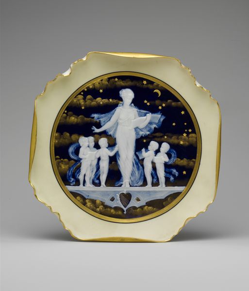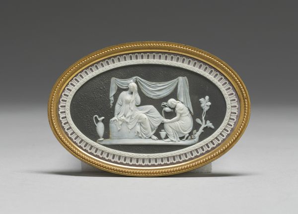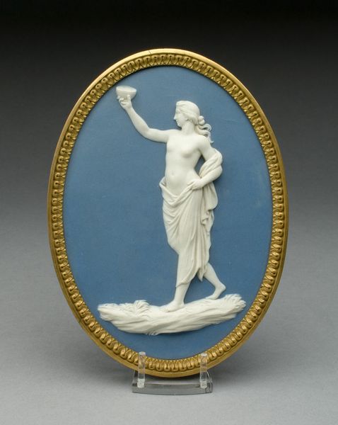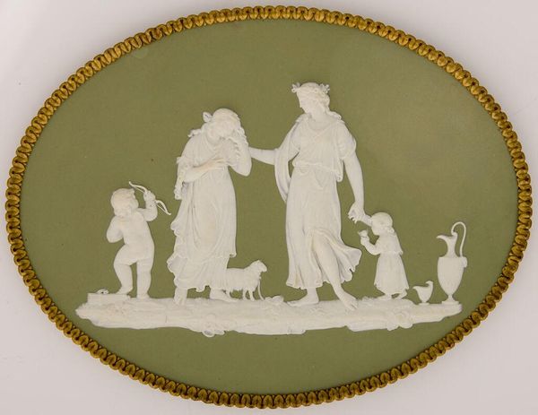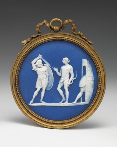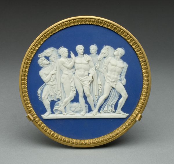 This is an oval medallion depicting the Judgment of Hercules, created by the Wedgwood Manufactory. The narrative is drawn from classical antiquity, a period that held particular fascination during the 18th and 19th centuries. Hercules, the Roman name for the Greek hero Heracles, stands between two female figures: Virtue, on the left, points upwards to the path of duty and glory, while Pleasure reclines on the right, inviting him to a life of ease. Such allegories were frequently used to instruct the elite on morality and the necessity of choosing a virtuous path. Consider how the depiction of Hercules as a muscular, nude male, contrasts with the draped, idealized forms of the female figures. These stylistic choices reflect prevailing gendered expectations. The medallion invites us to reflect on the choices we make and the values we prioritize. It offers a glimpse into the historical construction of morality, and the representation of gender and the human condition.