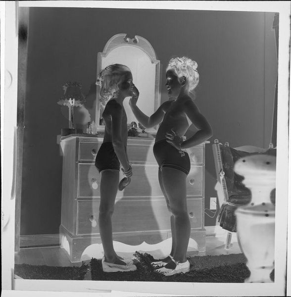 Editor: This is an intriguing gelatin silver print by Jack Gould, titled "Untitled (young girls playing dress-up and putting on make-up)." The composition and materials feel so intimate. What can you tell me about it? Curator: Given the context of photographic materials readily available, we can consider the social implications of access to photographic processes and image-making, allowing for a wider range of subjects and perspectives to be documented and shared. How does that influence the representation here? Editor: That's a really interesting point. I guess it makes it more accessible and personal. Curator: Exactly, and consider how the materiality of the print itself influences our perception of the girls and their world. It's about labor, materiality, and consumption. Editor: That's given me a lot to consider about the piece. Thanks!