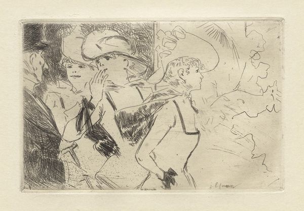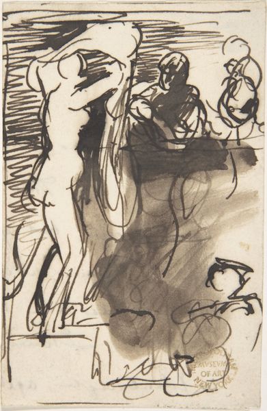 Editor: We are looking at "Salome," a 1916 ink drawing by Lovis Corinth. I am struck by the frenetic energy of the lines, how they capture a sense of movement and even anxiety. What are your observations about the composition? Curator: The rapid, almost chaotic, application of ink certainly establishes a dynamic surface. Note how Corinth uses line weight to define form and create areas of shadow. The varying densities contribute to the overall tension within the piece. What do you make of the spatial relationships within the composition? Editor: It feels a little disorganized; some forms emerge clearly, like the figure of Salome herself, but others seem fragmented or unresolved. It isn't quite clear to me if that contributes to or detracts from the artwork’s overall impact. Curator: Indeed. It presents an ambiguous rendering. That push and pull between definition and ambiguity, one could argue, is fundamental. It's about Corinth investigating the plasticity of line and the suggestive power of fragmented form. How do you think that informs our understanding of Salome, the biblical figure? Editor: Perhaps the fragmented figures mirror her own conflicted and unstable character. Maybe it mirrors something about the wider political context from when it was created in 1916, at a time of anxiety for many. Curator: A solid interpretive point. Corinth seems to favor an Expressionistic impulse towards conveying psychological or emotional states, rather than a straightforward narrative depiction. That expressive fracturing of form does a great deal to convey instability, wouldn't you agree? Editor: Yes, absolutely. Focusing on how the materials shape meaning offers a new avenue for grasping German Expressionism's nuances. Curator: Precisely. This close formal engagement reveals much about Corinth’s artistic intent.