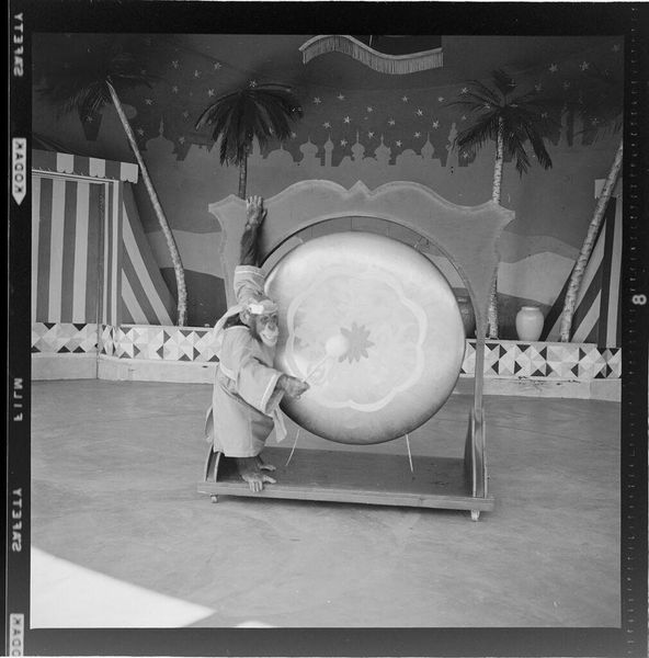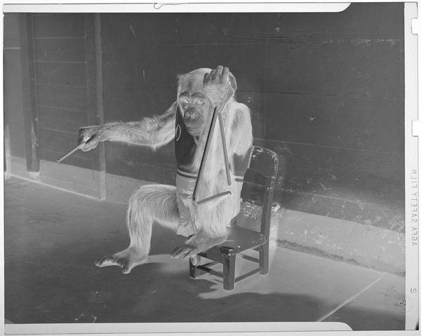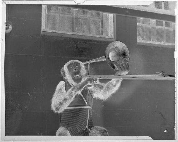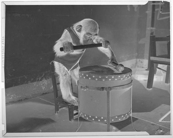 Curator: This captivating image from the Harvard Art Museums, by Jack Gould, features a monkey in a zoo band, specifically playing a large drum. Editor: The stark contrast immediately grabs you, doesn’t it? The textures, from the monkey’s fur to the smooth drum surface, create an engaging visual experience. Curator: Absolutely. Consider the implications of labor and entertainment. The image raises questions about the monkey's role—the work performed, and the implied consumption. Editor: And the composition itself—the circular form of the drum against the backdrop, combined with the monkey's posture creates a dynamic yet contained energy. Curator: This image reminds us to consider the commodification of animals, the labor they perform, and the socio-economic structures that enable such displays. Editor: I agree and all of this is successfully conveyed using simple shades, composition and texture. Curator: Indeed, a potent reminder of the complex relationships at play in our world. Editor: Well, it’s certainly given me something to reflect on.