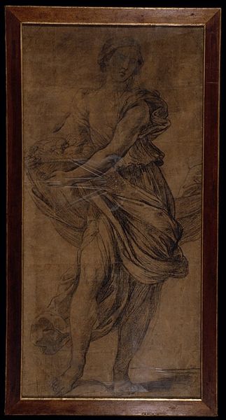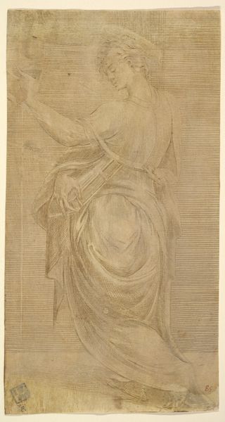 Editor: This charcoal drawing is "Saint Paul Rending His Garments" by Raphael, created around 1515. The figure seems so full of contained energy. What visual elements contribute to the powerful sense of emotion captured here? Curator: Note the strategic use of line. Observe how Raphael employs dense, cross-hatched lines to build form and shadow, creating a powerful three-dimensionality. Consider the dynamic pose, with the figure's implied movement countered by the static verticality of the drapery. Doesn’t this interplay create a visual tension that echoes the emotional turmoil of the subject? Editor: Yes, I see that now. The strong contrast of light and dark, especially in the drapery, emphasizes that tension even further. It almost feels like the fabric is a cage. Curator: Precisely. Examine, too, the directionality of the strokes. Notice how they follow the contours of the body, reinforcing its volume and muscularity. This reinforces a potent image of inner conflict played out through masterful control of line and form. It’s almost as if the emotion is rendered through line itself. Editor: That's fascinating. I'd initially just focused on the drama of the pose. Analyzing the actual mark-making opens up a whole new layer of understanding. Curator: Indeed. By understanding how the elements of art contribute, it is easier to read art on a structural level. It's how it attains an everlasting quality.