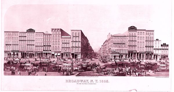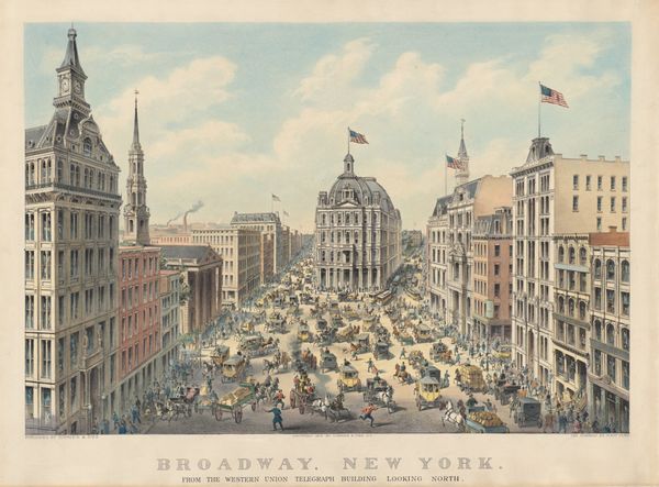 Curator: This is "Printing-House Square, New York," created around 1866 by Endicott & Co. It's a lithograph and etching, a detailed depiction of a bustling cityscape. What’s your first impression? Editor: It's fascinating how the soft color palette contrasts with the subject matter. All the buildings and figures create a feeling of controlled chaos, doesn't it? I'm particularly drawn to how much human labor it would've required to create something so intricately detailed at that scale. Curator: Absolutely. Look at how Printing-House Square itself served as a central hub, literally the place where news and information were mass-produced and distributed, shaping public opinion and reflecting the pulse of the city after the Civil War. It also reflects the role of newspapers such as the "Tribune" as a force in public life. Editor: The level of detail is captivating. Consider the skill required to render all of that intricate detail using etching and lithography. What does this meticulous craft tell us about the status of printmaking in society? And how did these advancements impact the perception and consumption of imagery at this time? It's no mere depiction; it’s a constructed view reliant on industrial capabilities. Curator: That's right. This image functioned as a record and promoter of a specific urban narrative. Consider how the scene presents an idealized vision of post-war New York. This area was the literal crossroads where information, commerce, and politics converged and affected public perceptions of urban space. Editor: Yes, the perspective it presents also reflects the means by which these perspectives were constructed and circulated. And how many of these images were actually consumed locally? The print would have allowed for wider distribution, making it crucial to shape a national image of progress and urban dynamism. Curator: I think you're right. It serves as an idealization of a unified nation. Endicott and Co. helped shape that image, and, like newspapers themselves, participated in political life as much as they simply reflected it. Editor: A powerful reminder of how art intertwines with both the means and the message, I think. Curator: Agreed, it’s fascinating to see how that interplay unfolded.