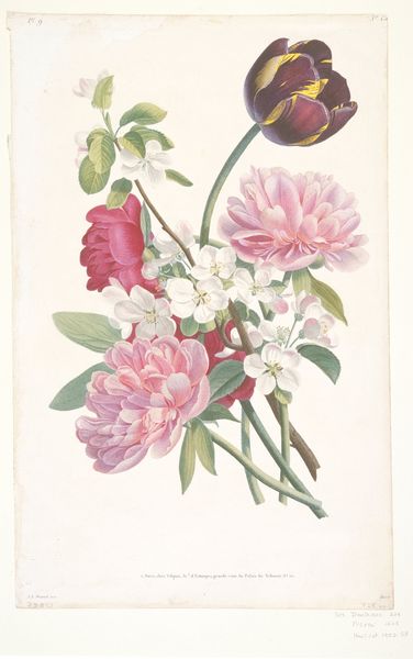 Curator: Take a look at this lovely botanical illustration, "Lathyrus latifolius (Everlasting Pea)," created in 1827. Editor: It's delicate, isn't it? A certain sweetness radiates from the composition with the soft, rosy petals and verdant leaves. It feels…serene. Curator: Indeed. The unknown artist meticulously captured every detail. The medium includes drawing, tempera, and print. Think of the labor and skill involved. Editor: Speaking of detail, look closely at the curvature of each petal, the almost tangible texture achieved through subtle shading. The artist uses line and colour masterfully to depict the structure of this delicate subject. How interesting that this careful attention makes the drawing also seem quite fragile and transient. Curator: It does. Given the prevalence of botanical illustrations at the time, commissioned by wealthy landowners to document their collections, I wonder about the societal context surrounding this particular piece. Was it intended for scientific study, decorative purposes, or perhaps both? The availability of resources necessary for such prints hints at patronage and access, really raising the question of consumption of botanical beauty at that time. Editor: Certainly. However, stripping away its social implications for a moment, what remains is an image of compelling simplicity and balance. Note how the composition leads the eye upwards from the broad leaves to the delicate buds. It is such a pleasing arrangement, guiding our attention to different forms and planes. Curator: You can really appreciate the elegance inherent in the materials as well: the paper itself, the inks and pigments chosen for their subtlety. It also reflects, for me, the increasing commodification of nature as knowledge, packaged for elite consumption. Editor: Ultimately, both avenues lead to appreciating the layers within this piece. Thank you for pointing out these critical factors related to production. Curator: And thank you for lending your keen eye toward the beautiful structure. Editor: Absolutely! This discussion really brought this artwork into new light for me.