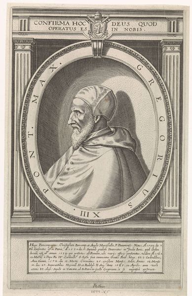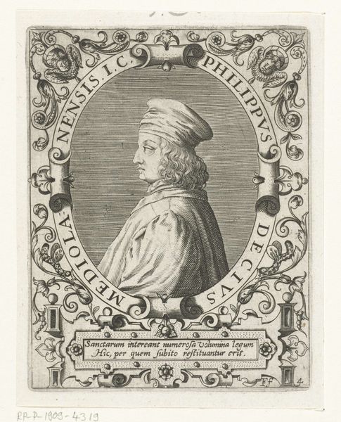 Curator: This is a portrait of Giasone del Maino, made sometime between 1597 and 1669 by Theodor de Bry. It’s an engraving, currently held at the Rijksmuseum. Editor: The stark lines create a rather serious, almost austere, atmosphere. It feels formal, deliberate, the way the sitter's face is rendered in profile...very controlled. Curator: Absolutely. The engraver’s precise application of line lends itself to a formal register. We might also think about the role of portraits in conveying status during this era. Consider too how the composition is broken up by its decorative frame. Editor: Ah, yes, the framing. Intricate flourishes that enclose the central oval. And the strange animals sitting below—what's that about? Curator: The frame, bustling with foliage and figures, directs attention. This decorative style recalls Mannerist and Baroque trends popular during that period. I suppose those fantastical creatures point to a kind of elevated prestige, hinting at the sitter’s stature through symbolism. They almost mimic the function of supporters or heraldic beasts that frame a crest, or royal shield. Editor: True. So, the meticulousness of the line, the profile view, the deliberate symbolism…it all points to the subject's significance in the context of his world. I also notice that the sitter's gaze avoids ours completely, but his is set forward in determination. Curator: A perspective enhanced by his slightly pursed lips. It projects authority and learnedness, aligning with his profession; del Maino was a renowned jurist. De Bry clearly chose to depict the sitter in a manner that would best reflect his intellectual prowess and civic virtue. Editor: So, we're not just seeing a man, but an ideal being communicated through visual language. Curator: Precisely! Editor: Considering the layers of composition, the portrait becomes a cultural artifact—a visual record of the values upheld during the period it was crafted. Thanks, this has been truly illuminating! Curator: My pleasure. It is always a worthwhile effort to unravel the historical threads woven into these artworks!
