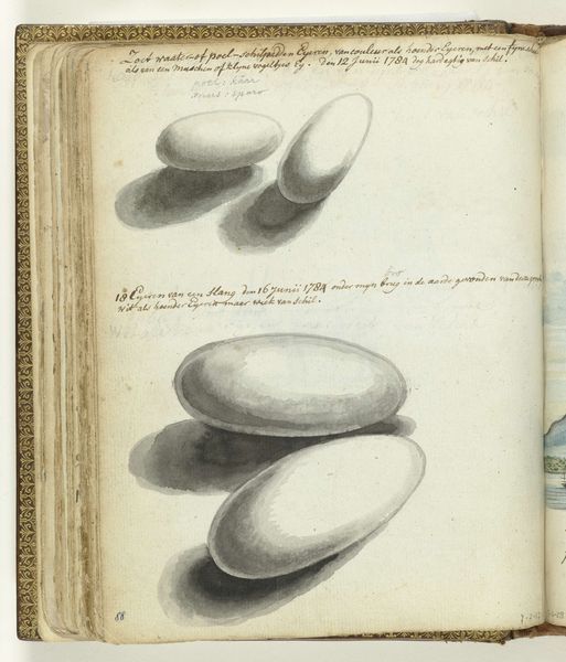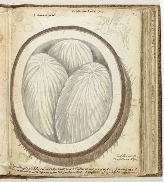 Jan Brandes made this drawing of a durian fruit with ink and watercolor in the late eighteenth century. Brandes was an employee of the Dutch East India Company which, during that time, had a monopoly over trade in the region. This botanical drawing offers insights into the cultural exchange between Europe and Southeast Asia during the colonial era. The meticulous detail reflects a scientific interest in cataloging and understanding the natural world. However, it also served economic interests by documenting resources that could be exploited for trade. The inclusion of Dutch text alongside the image suggests an audience within the Company, who were likely interested in the durian's potential commercial value. The durian, a fruit native to Southeast Asia, was exotic to Europeans. Through detailed records such as this drawing, the Dutch East India Company catalogued foreign societies and customs. Understanding this artwork requires exploring the archives of the Dutch East India Company and other historical sources.