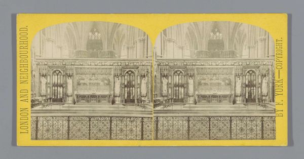 Curator: Frederick York's gelatin-silver print, "Hoogaltaar van Westminster Abbey in Londen," dating from approximately 1860 to 1880, captures the sublime interior of the abbey. Editor: The mood strikes me as austere yet romantic. The cool tones and the detail almost disappearing into the depths evoke a sense of mystery. Curator: Indeed. York uses the relatively new medium of photography to not just document but also to interpret. Look at how the linear perspective converges, drawing the eye toward the altar. The light, while subdued, articulates the ornate detailing. Editor: Considering the historical context, how do you interpret York’s choice of Westminster Abbey? Was he commenting on the power of the church, or appealing to national pride through this recognizable architectural symbol? The Romanticism is visible, though somewhat tempered by the architectural subject, a contrast between freedom and restriction. Curator: Both could be true. We see similar impulses throughout the Victorian era. The architecture, specifically, exemplifies complex gothic revival. Consider also how site-specific photography shaped the visual culture of the time, solidifying perceptions. Editor: The very act of photographing transforms the space; it contains and frames a site laden with meaning for the contemporary viewer, offering them visual access. Curator: It presents an intriguing dance between faith, nationalism, and rapidly evolving technology. What appears at first as mere documentation carries with it cultural and artistic reverberations. Editor: Absolutely. The stark contrasts, subdued grandeur and layered symbolism make it much more than simply just a landscape photograph. It’s a loaded space made newly accessible by technology.