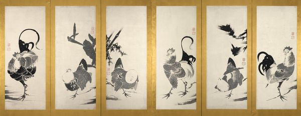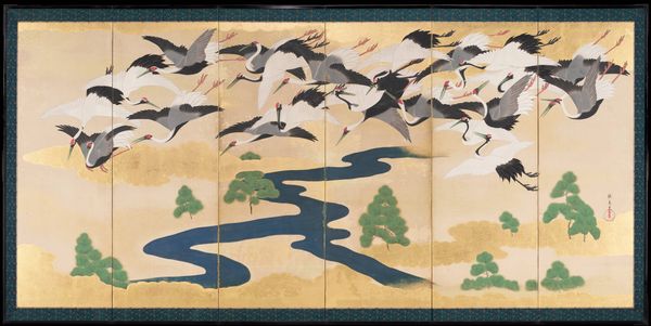 Editor: This gorgeous tempera painting, "Flock of Cranes," comes to us from 18th century Japan, courtesy of Ishida Yūtei. There's such vibrant energy in how the cranes are posed; they feel like they're on the verge of taking flight. How do you interpret the symbolism of these cranes, considering their cultural context? Curator: The choice of cranes isn’t accidental. In Japanese art, they often symbolize longevity, good fortune, and marital fidelity, powerful concepts in 18th-century Japanese society. Their presence can be seen as an aspiration, a visual mantra woven into the daily lives of those who viewed this piece, probably a member of the court or someone of high status, as these types of artworks adorned castles and wealthy residences. Editor: So, it’s not just a pretty picture; it's communicating certain values. Curator: Exactly. Consider how ukiyo-e traditions frequently focused on idealized beauty and pleasure, catering to a largely male audience, but a screen like this would serve as a constant reminder of different ideals within the domestic sphere. Are the values of longevity, family, and fortune inherently good, and who did they benefit most? Who was left out, whose experiences were not visible in elite artistic productions such as this one? These are important questions. Editor: That really makes me think about who had access to these types of artworks and how they might have reinforced existing power structures. Curator: And how that plays out even today in museums! Who feels welcomed, whose stories are amplified and celebrated versus silenced or overlooked? Editor: This definitely gives me a new perspective. I am really questioning whose gaze it was originally meant for. Curator: Right! Thinking critically about the socio-political contexts interwoven in artworks from the past enables us to foster richer and more inclusive encounters with the art of today.