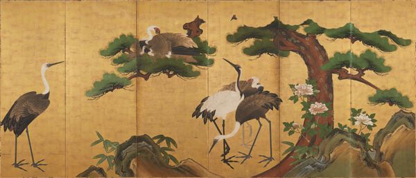 Ishida Yūtei was the teacher of Maruyama Ōkyo (1733–1795), the famous and influential champion of Western-influenced naturalism in Japan during the 18th century and founder of the Maruyama School. Although trained in the traditional Kano school methods, Yūtei was typical of Kano artists of his time in adopting an eclectic approach to painting. Here, he combined the monumentality and stylization associated with Kano painting with the repetition of a single theme often seen in Rinpa school painting. While Yūtei may have derived the postures of individual cranes from Kano instruction manuals, the idea of combining them all to depict an entire flock presages Ōkyo's interest in naturalism.